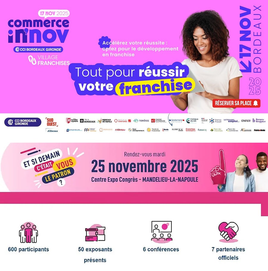 Le lundi 17 novembre, nous serons présents au Village Franchises du salon Commerce Innov, organisé par la CCI Bordeaux Gironde. Vous pourrez rencontrer Geoffrey Gondat, chargé de développement réseau, sur le stand N°39.
